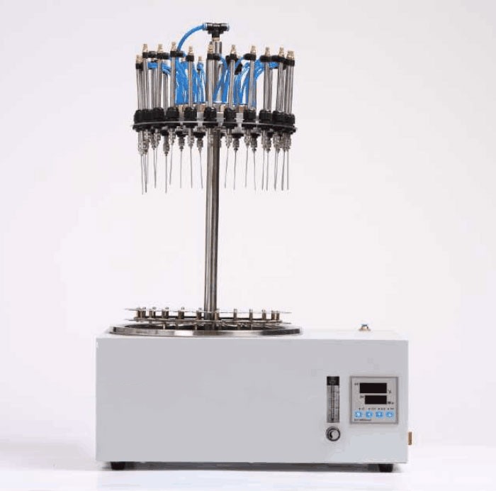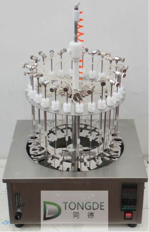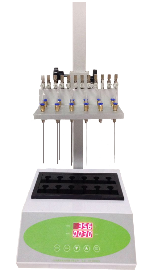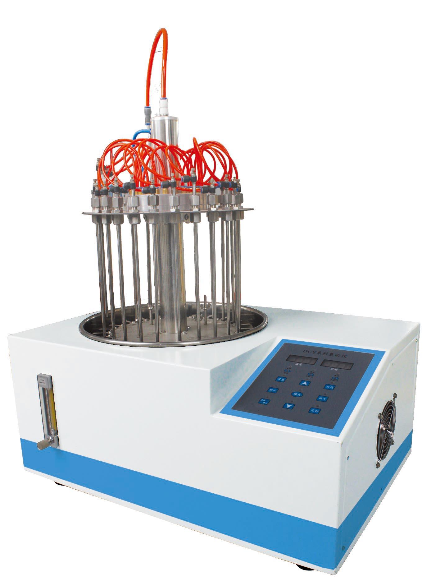 本儀器包括底座和支架裝置、樣品架和氣體分配系統(tǒng)。試管通過帶彈簧的試管夾和支撐盤來固定位置。每個樣品位都有數(shù)字編號;氣體通過流量計到達氣體分配系統(tǒng),靈活的引導(dǎo)管將氣體導(dǎo)入每個位置的閥和不銹鋼針,將氣體吹至樣品表面,從而使溶劑快速揮發(fā)。根據(jù)試管大小和溶劑多少,各導(dǎo)氣管可獨立升降至合適的高度。