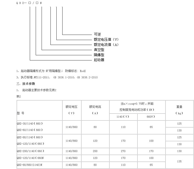 QBZ礦用隔爆型可逆真空電磁起動器、QBZ系列礦用隔爆型真空電磁起動器(以下簡稱起動器),適用于煤礦井下或周圍空氣中含有爆炸性氣體(甲烷)工礦企業(yè)中,主要用作直接控制頻率50Hz,額定電壓1140/660V,額定電流在30-200A范圍內(nèi)的三相鼠籠式感應(yīng)電動機(jī)的起動和停止,并可在停止時進(jìn)行換向。