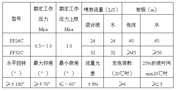 PP24C/PP32C型消防炮為單炮筒,即一支炮筒即可噴射泡沫也可噴射水,操作手柄實(shí)現(xiàn)炮仰、俯、回轉(zhuǎn)。